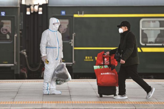 1月16日,在嘉興火車站乘車返鄉的旅客們都自覺做好了個人防護,嚴格遵守車站疫情防控規定,有序排隊乘車。
