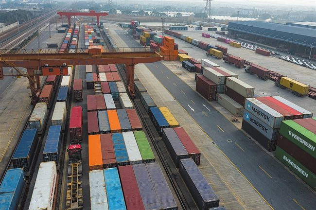 1月19日,在湖州長興南鐵路貨場,工作人員正在裝卸貨物。2021年,該貨場裝車33536輛次,共發送876703噸貨物,運輸收入8900萬元。目前,該貨場通過優化作業班組,正全力沖刺一季度生產指標。(伊凡)