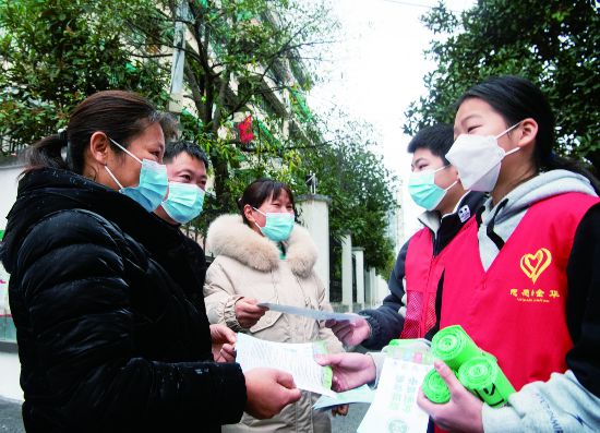 1月23日,在金華婺城區城西街道河盤橋社區,租住在老肉聯宿舍等地的外來務工人員子女,趁著放寒假當起垃圾分類宣傳員,給河盤橋社區居民分發宣傳冊,講解《金華市生活垃圾分類管理條例》和“兩定四分”投放規定,協助社區向居民贈送垃圾袋。(時寬兵)