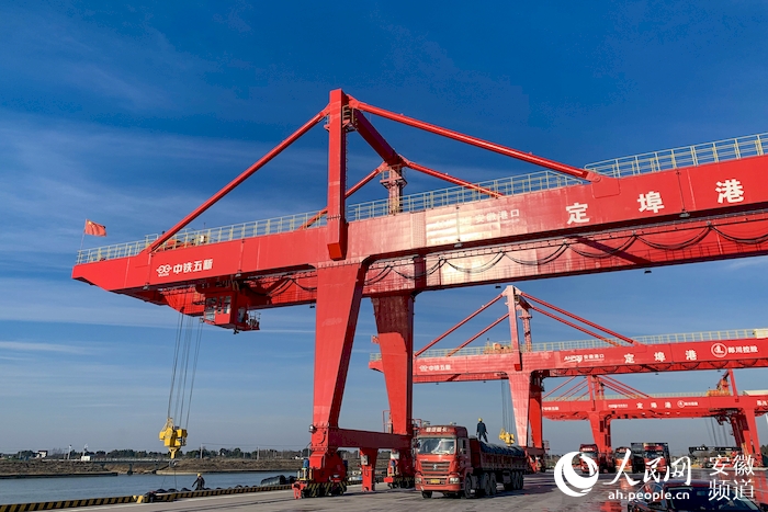 站在位于梅渚鎮周家村,蕪申運河右岸的定埠港,640米長的港口岸線上一派繁忙景象。據悉,定埠港現有1000噸級泊位8個,其中固定吊2臺、圓弧形軌道裝船機2臺、32噸通用龍門吊2臺、40.5噸集裝箱龍門吊2臺、45噸正面吊1臺,配套倉儲用地4萬多平方米,作為安徽省開通的首個縣級集裝箱航線,自2019年6月28日開港運營以來,已實現吞吐量800多萬噸。
