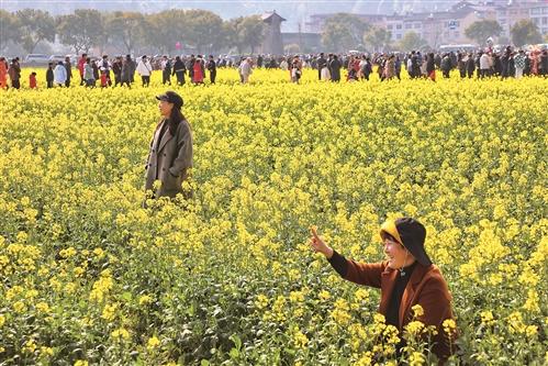 2月5日,臺州臨海市桃江十三渚景區內,游客徜徉在大片油菜花田里,欣賞家門口的田園風光。立春過后,金黃的油菜花競相盛開,形成了一幅幅美麗的鄉村畫卷。(潘侃。
