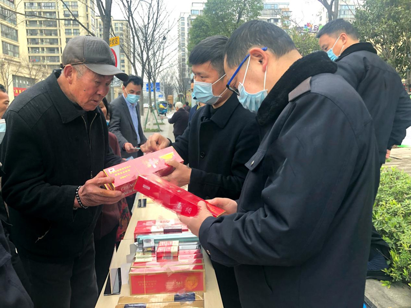 專賣管理人員為社區居民提供真假煙鑒定咨詢。寧波市煙草專賣局供圖