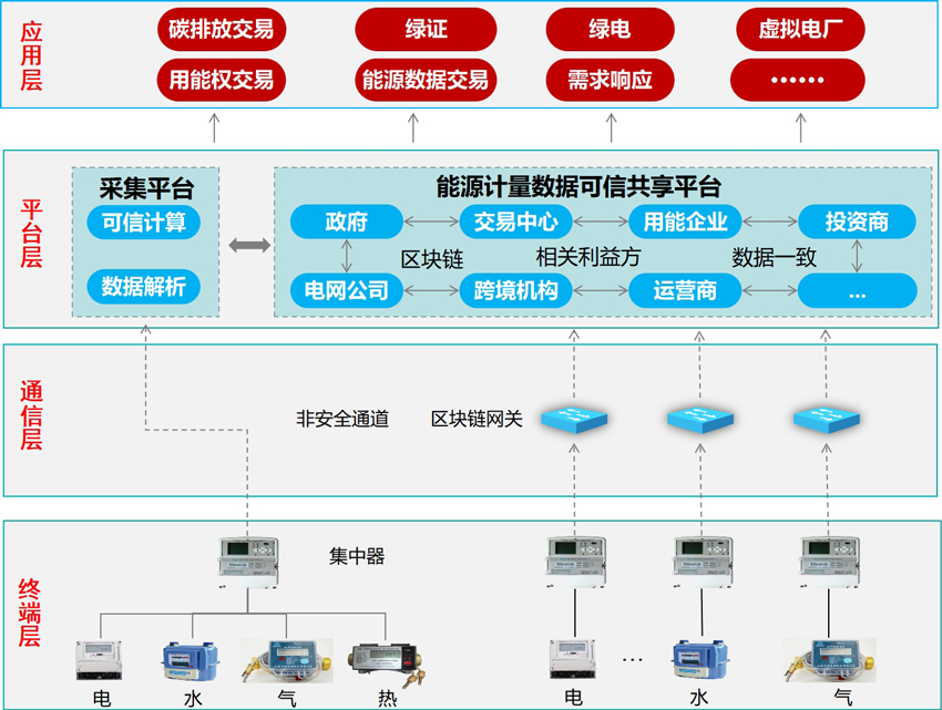 基于區塊鏈的能源計量數據共享平臺參考架構示意圖。顏擁制圖