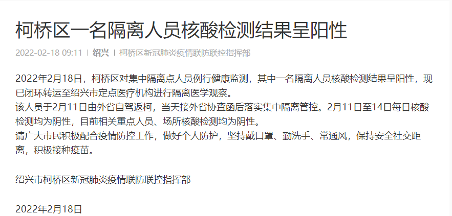 2022年2月18日,紹興市柯橋區新冠肺炎疫情聯防聯控指揮部發布公告稱,柯橋區對集中隔離點人員例行健康監測時,發現其中一名隔離人員核酸檢測結果呈陽性,現該隔離人員已閉環轉運至紹興市定點醫療機構進行隔離醫學觀察。