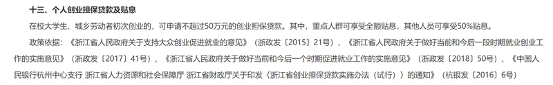 在浙江省人社廳官網,可以搜索到一份發布于2019年1月的《浙江省主要就業創業政策清單》。其中,在“個人創業擔保貸款及貼息”一項中,就明確“在校大學生、城鄉勞動者初次創業的,可申請不超過50萬元的創業擔保貸款。其中,重點人群可享受全額貼息,其他人員可享受50%貼息”,并有多項政策依據。