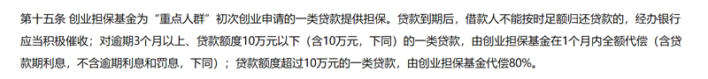2016年5月印發的《浙江省創業擔保貸款實施辦法(試行)》,又對此進行了更詳細的說明。其中第十五條提到,創業擔;馂椤爸攸c人群”初次創業申請的一類貸款提供擔保。貸款到期后,借款人不能按時足額歸還貸款的,經辦銀行應當積極催收;對逾期3個月以上、貸款額度10萬元以下(含10萬元,下同)的一類貸款,由創業擔;鹪1個月內全額代償(含貸款期利息,不含逾期利息和罰息,下同);貸款額度超過10萬元的一類貸款,由創業擔;鸫鷥80%。