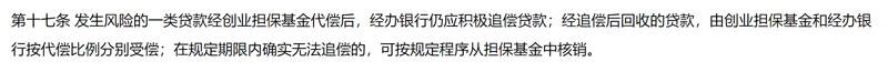 第十七條則稱,發生風險的一類貸款經創業擔;鸫鷥敽,經辦銀行仍應積極追償貸款;經追償后回收的貸款,由創業擔;鸷徒涋k銀行按代償比例分別受償;在規定期限內確實無法追償的,可按規定程序從擔;鹬泻虽N。