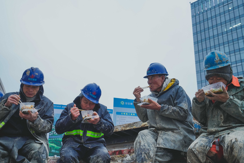 工人們在施工間隙抓緊吃飯。余杭區交通運輸局供圖