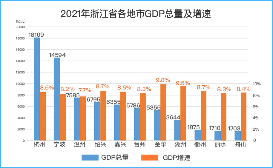 2021年國內GDP增速,浙江11市中10座城市跑贏了全國8.1%的增速。其中,增速最快的是金華市,同比增長9.8%,GDP總量順利突破5000億元大關,達到5355.44億元。至此,浙江共有7市的GDP總量在5000億元以上,其中還有2座萬億城市。