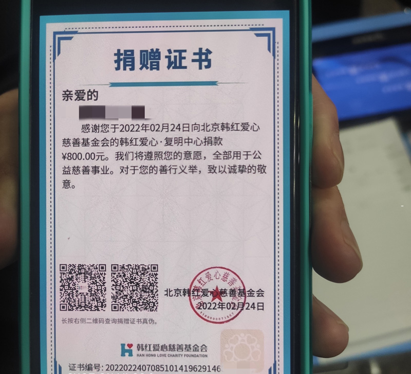 劉先生將“騙”得的800元,捐獻給了慈善基金會。彭埠派出所供圖