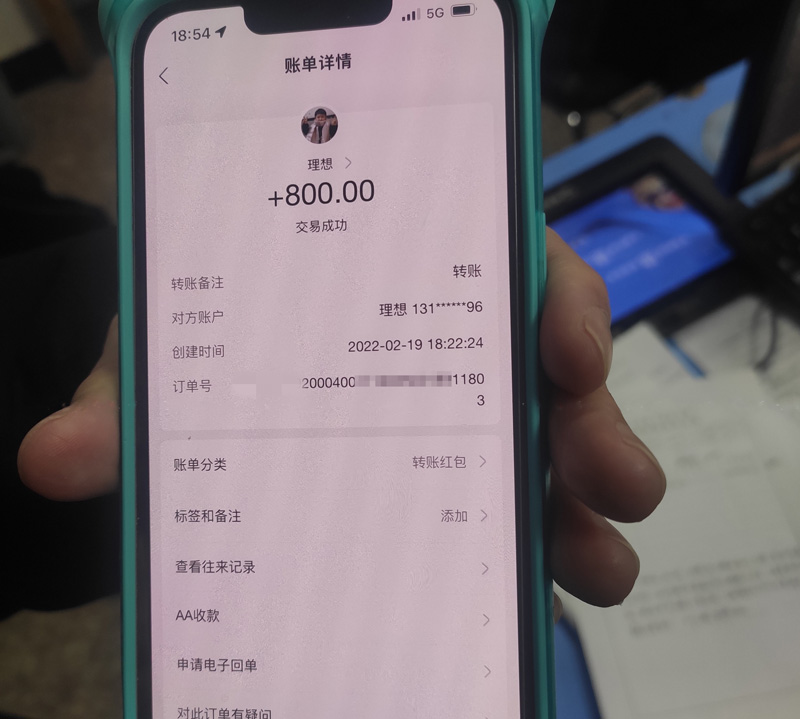 對方主動將800元一分不少的轉給劉先生。彭埠派出所供圖