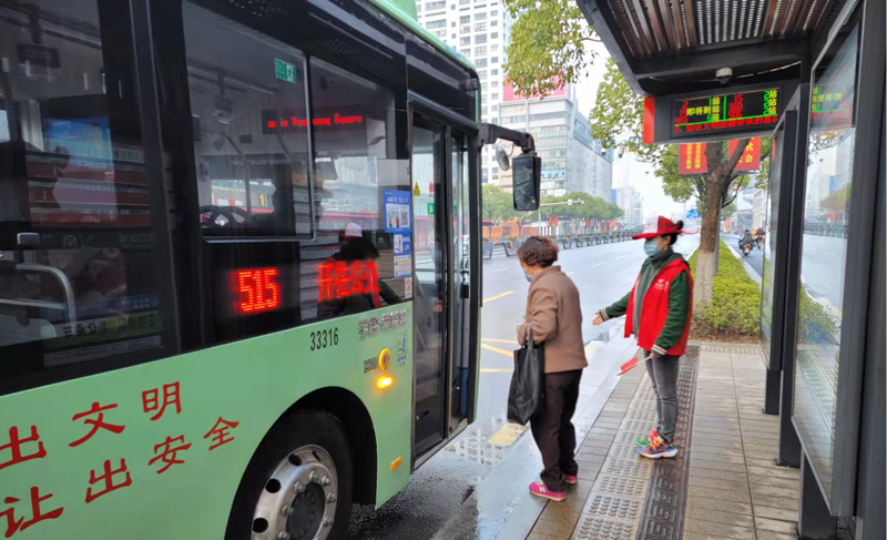 志愿者在公交站服務。浙江電信供圖