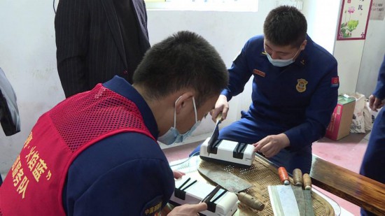 “青春火焰藍”志愿服務隊帶來了兩臺磨刀機,為居民免費打磨各種家用刀具,解決生活中的小難題。