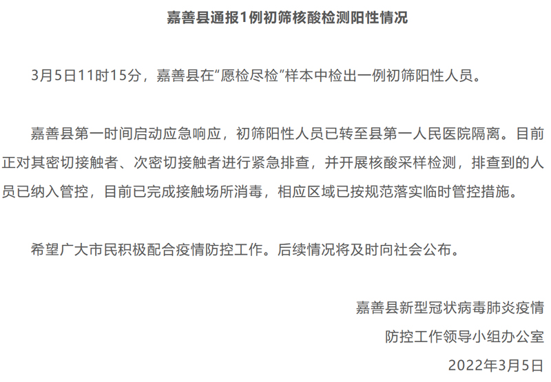 3月5日上午,嘉興市嘉善縣通報1例初篩核酸檢測陽性情況,通報全文如下: