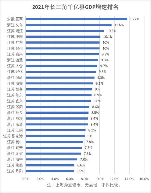 2021年長三角千億縣GDP增速排名(數據來源:各地政府網站)。制圖:方彭依夢