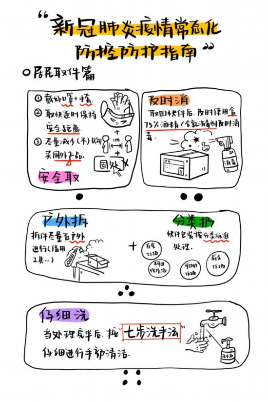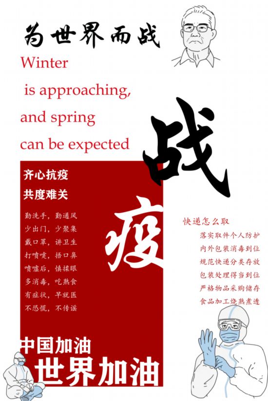 “新冠肺炎疫情常態化防控防護指南”“為世界而戰”“落實‘強’‘落’‘規’‘嚴’加強進口食品疫情防控”,學生們把一句句警示標語用各種形式體現在海報中。內容不僅涉及注意內外包裝消毒、有效減少“物傳人”現象等,還建議快遞公司規范快遞分類存放、包裝處理得當到位,提倡食物熟加工、冷鏈掃源碼等等。