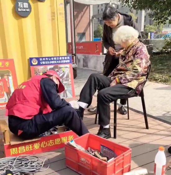 磨剪刀、修自行車、補輪胎、擦皮鞋……每個月的8日、18日、28日,在紹興路與香積寺路汽車街廣場都會看見一群紅衣志愿者在進行志愿服務。其中領頭的,正是杭州公安交警拱墅大隊康橋中隊的輔警周昌旺。