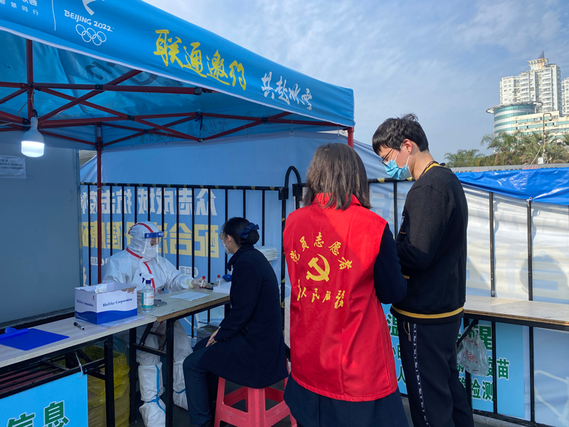 溫州站站前廣場核酸檢測點,車站工作人員組成的志愿者正在引導旅客有序開展核酸檢測。范凡攝
