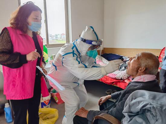 “大爺您到這邊坐下,我們來給您做核酸了!迸藭凿h強忍住手部脹痛,攙扶老人坐下,一絲不茍地完成采樣工作。
