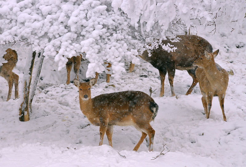 雪中的野生華南梅花鹿鹿群。章叔巖攝
