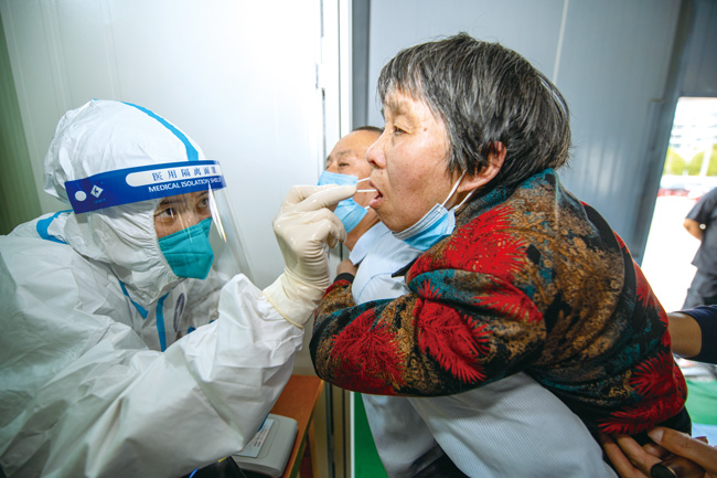 3月16日,在金華市金東區曹宅鎮核酸檢測點,644路公交車駕駛員曹水能背著70歲的孤寡老人莊根茶做核酸檢測。莊根茶是曹宅鎮七寶塘村村民,老伴和兒子已相繼去世,因行動不便,她的日常出行成了難題。從2012年開始,只要莊根茶需要乘車外出,曹水能都負責背她上下車,一背就是10年。(胡肖飛)