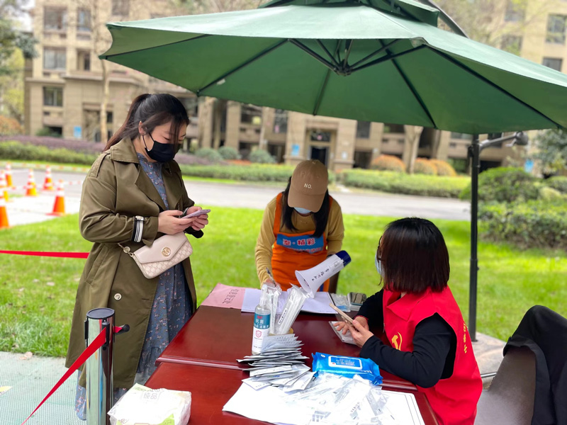 3月15日,在杭州余杭區中泰街道幸福河社區,居民們正有序進行新冠抗原自測。熟悉的手機鈴聲第三次響起時,手頭正在忙著志愿服務工作的何敏芳才接起了電話。