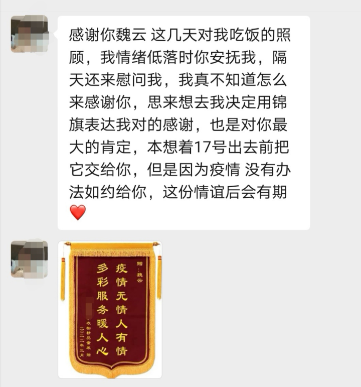 “感謝你魏云,我情緒低落時你安撫我,隔天還來慰問我!3月15日,衢州喆縵隔離點一名隔離人員將一張印有“疫情無情人有情,多彩服務暖人心”的錦旗版圖,通過微信發給柯城區人社局社保中心黨員干部魏云,表達自己誠摯的謝意。