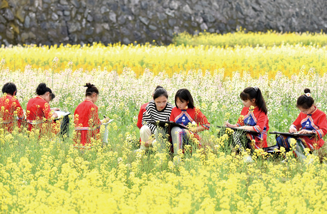 陽春三月,金華市武義縣柳城畬族鎮縣前村油菜花已開成一片彩色花海,如同大地繪就的一幅田園畫卷,吸引游人、學生前來踏春賞花、寫生。(翁國宏、張建成)
