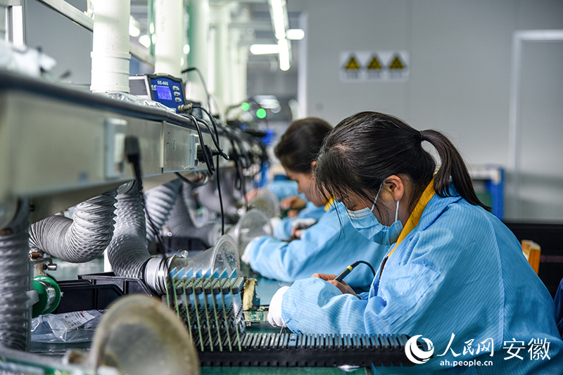 安徽中科光電色選機械有限公司電子元件加工車間內,工人正在焊接產品電子元件。人民網 李希蒙攝