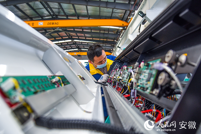 安徽中科光電色選機械有限公司的工人正在進行設備最終組裝調試。人民網 李希蒙攝