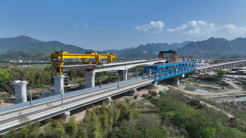“由于跨杭黃特大橋臨近即將開通的湖杭鐵路,如果我們不趕在湖杭鐵路開始聯調聯試前完成23孔箱梁架設任務,就有可能影響到湖杭鐵路的營業線施工。因此,今年首季以來,我們努力克服疫情影響,搶抓雨期、春節假期大干快上,為架梁工作順利進行創造條件!焙紲罔F路二期建設指揮部工程部管理人員張鐵軍說。