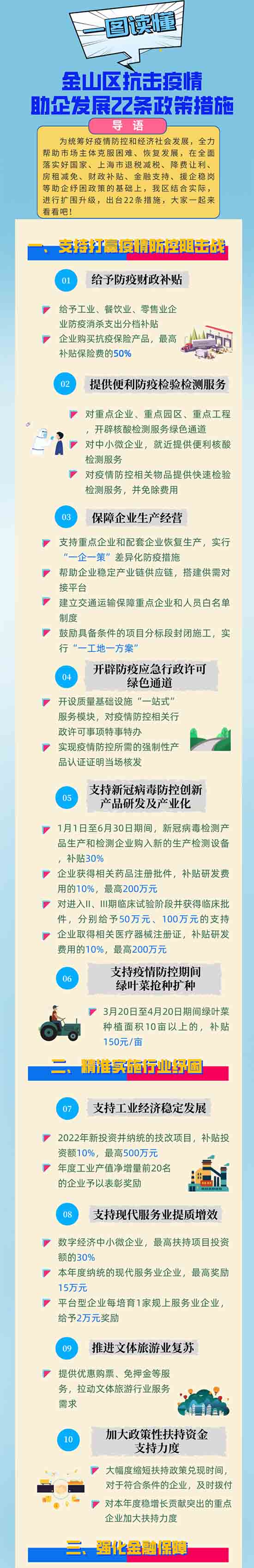 據悉,為統籌好疫情防控和經濟社會發展,全力幫助市場主體克服困難、恢復發展,在全面落實好國家、上海市退稅減稅、降費讓利、房租減免、財政補貼、金融支持、援企穩崗等助企紓困政策的基礎上,結合金山實際,進行擴圍升級,制訂《金山區抗擊疫情助企發展22條政策措施》!22條”既聚焦企業當前面臨的“難點”“痛點”“堵點”,又考慮到疫情后企業加快發展的各項訴求,共計包括六大方面內容,即支持打贏疫情防控阻擊戰、精準實施行業紓困、強化金融保障、開展援企穩崗、減輕企業負擔及優化提升服務,用實實在在的舉措,精準幫助市場主體紓困解難,穩定經濟增長。