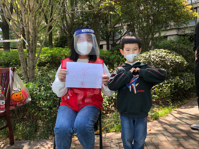 小朋友將親手繪制的“小紅花”送到了志愿者手上。江北區委組織部供圖