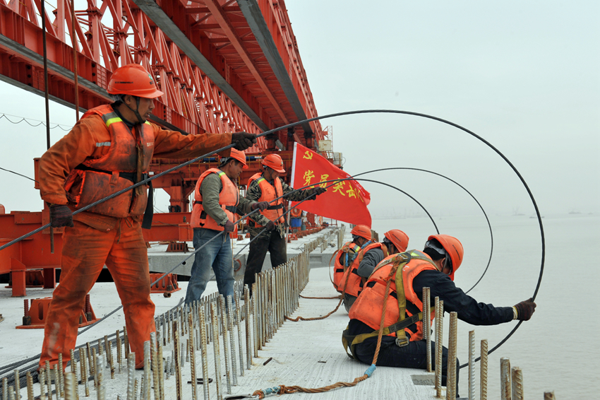 黨員先鋒突擊隊在魚山大橋建設現場。舟山市委組織部供圖