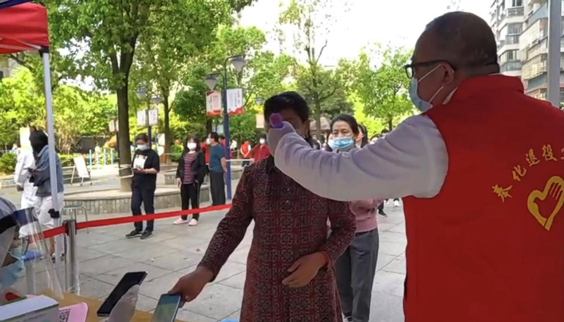 志愿者給前來做核酸檢測的群眾測溫。沈文捷攝