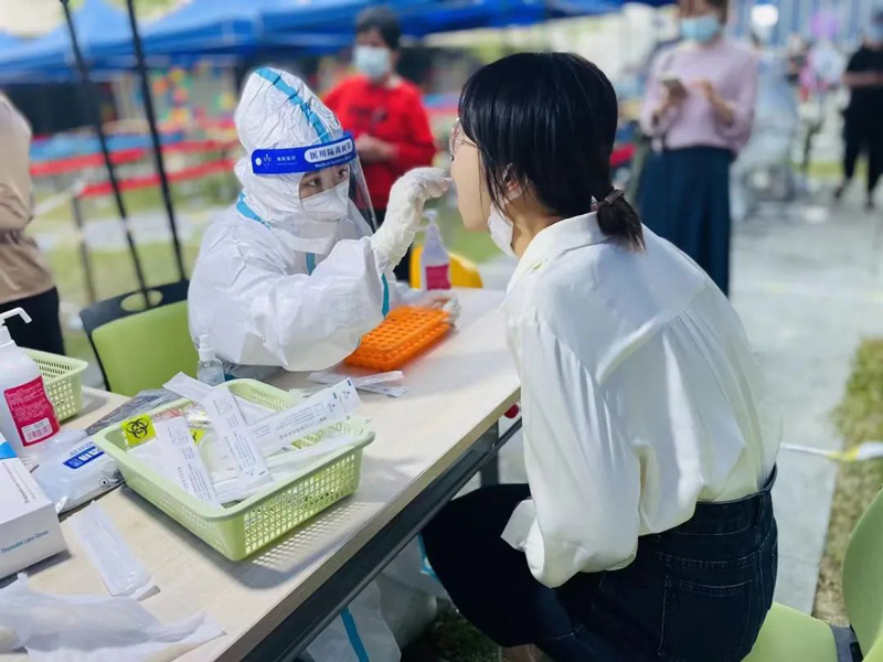 4月9日,蓮都區開展大規模核酸檢測。麗水市人民醫院主要負責蓮都區白云街道、紫金街道及兩所學校共68個點位300多個通道。在院部統一指揮下,360余名醫護人員迅速集結分別前往各個檢測點位。團委副書記李王駿等團員青年200余人參與其中,在抗疫一線,他們頂著烈日進行著核酸采集工作,對于行動不便的居民,他們不辭勞苦親自上門采樣;在方艙實驗室里,他們每天完成著數十萬人次的核酸檢測。