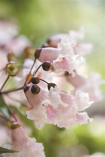 同樣被稱為植物界“活化石”的古楸樹,最近也迎來盛花期。楸樹的花形若鐘,粉紅簇擁在枝頭,隨風搖曳,令人賞心悅目。