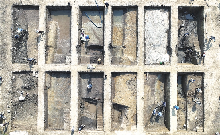 4月17日,湖州市德清縣雷甸鎮楊墩村,中初鳴制玉作坊遺址群小橋頭遺址點考古發掘現場,考古人員發現一批疑為良渚時期的古木樁和南宋時期的瓷器、瓷片。該遺址群已發現和確認多處遺址點,出土3000多件良渚時期的玉器、陶器等珍貴文物,是迄今長江下游地區發現的良渚時期最大的制玉作坊群遺址。(謝尚國)