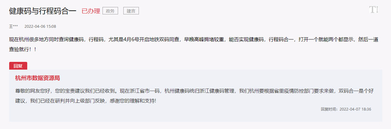 面對網友的建言,杭州市數據資源局工作人員回復,現在浙江省市一碼,杭州健康碼統歸浙江健康碼管理,杭州要根據省里疫情防控部門要求來做,并表示雙碼合一是個好建議,已經在研判并向上級部門反映。