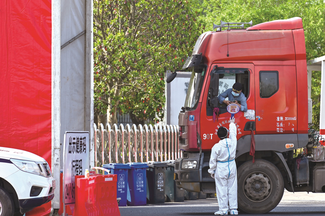 4月21日,在嘉興市嘉善縣天凝高速出入口,交警正在核驗過往司乘人員的健康碼、行程卡、核酸檢測報告和有無途經中高風險地區等信息,筑牢疫情防線,保障物流安全暢通。(張啟帆)
