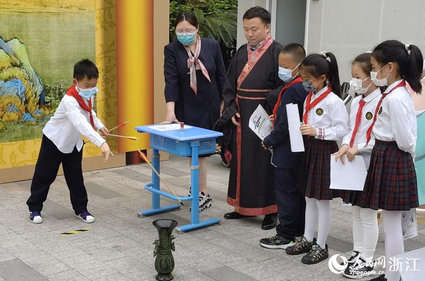 孩子們現場體驗投壺。這一運動游藝衍生自古代六藝的射禮,到宋代就已經普及為文人士大夫崇尚的文雅生活和社交方式。人民網 張帆攝