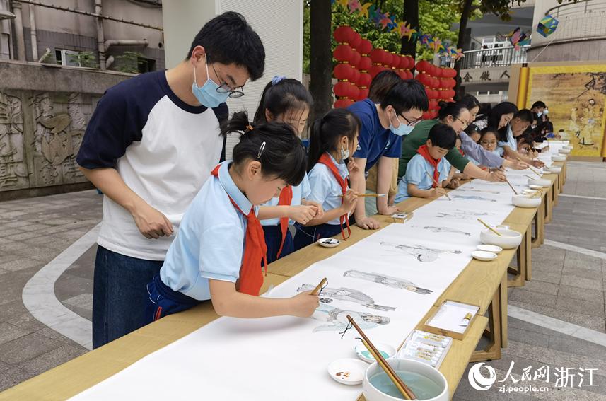 中國美術學院中國畫與書法藝術學院的大學生和中國美院附小的孩子們一起現場作畫。人民網 張帆攝