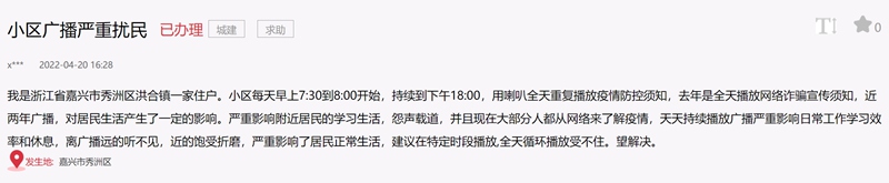 “小區每天早上7:30到8:00開始,持續到下午18:00,用喇叭全天重復播放疫情防控須知,去年是全天播放網絡詐騙宣傳須知,近兩年廣播,對居民生活產生了一定的影響。嚴重影響附近居民的學習生活,怨聲載道……”4月20日,浙江省嘉興市秀洲區洪合鎮的徐女士在人民網“領導留言板”反映,所住小區設置了防疫喇叭,每天音量非常大,從早到晚全天循環播放,聲音刺耳,嚴重擾民,希望相關部門關注處理。