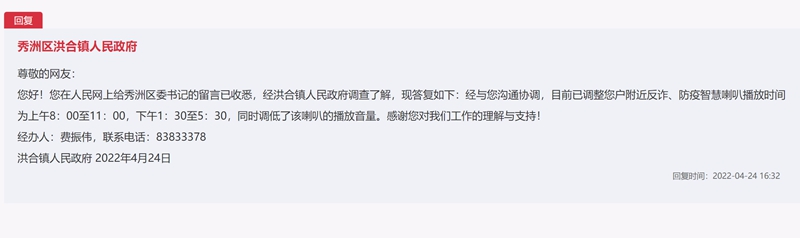 秀洲區洪合鎮人民政府對此高度重視,并于4月24日進行了回應,并回復稱,經洪合鎮人民政府調查了解,已與徐女士進行了溝通協調,目前已將徐女士所住小區附近的反詐、防疫智慧喇叭的播放時間調整為上午8:00至11:00,以及下午1:30至5:30,同時調低了該喇叭的播放音量。