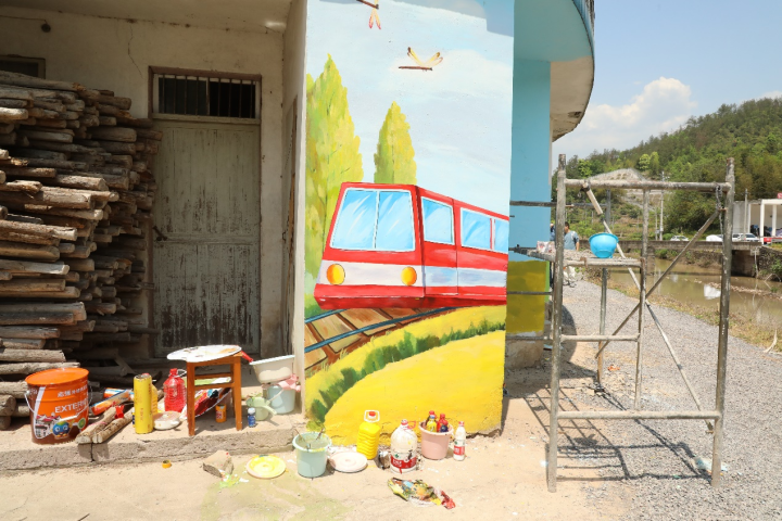 “美麗鄉村的建設給我們帶來了那么多的福利,我希望通過我手中的畫筆讓更多人看到村民勞動的果實、豐收的喜悅!表斨籽琢胰,25歲的周雨秋正在有條不紊地進行起形、調色、上色等步驟,“雖然我大學學的是美術,但畢業后就沒正兒八經地畫過畫了!比欢,村莊的變化給了周雨秋重拾畫筆的動力,她主動請纓,和另一位村民陳瑤一起組成團隊,利用休息時間將彩繪渲染在村前屋后。