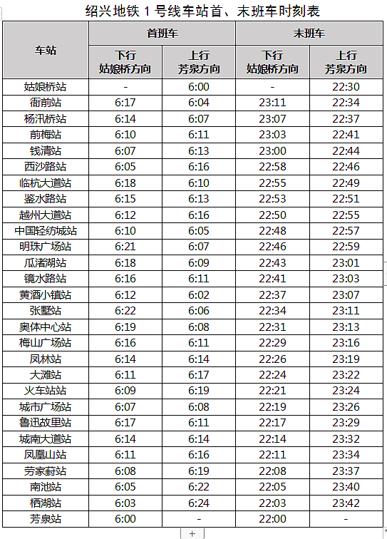 紹興地鐵1號線車站首、末班車時刻表。紹興市軌道交通集團供圖