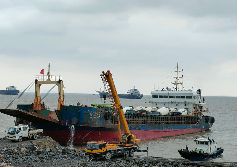 輪船要趁著漲潮把18輛混凝土車運到施工點。李楊木易攝