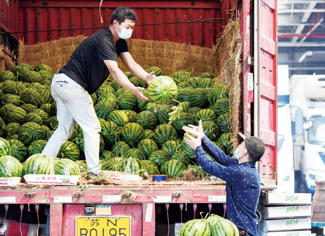 5月6日,華東金華農產品物流中心的經營戶從大貨車上卸下從山東、江蘇等地運來的西瓜。金華市交通運輸部門在嚴格落實疫情防控措施的前提下,加強與農副產品供應鏈企業、物流企業對接,開辟保供“綠色通道”,加大蔬菜瓜果等居民生活必需品運輸供應力度,提高物資配送效率,保障民生“菜籃子”。(李建林)