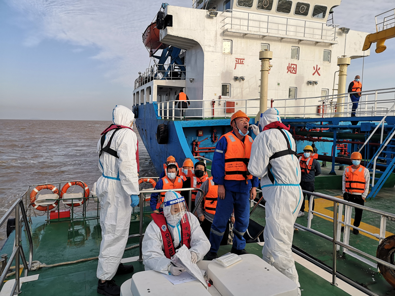 嵊泗海上網格服務團隊為船員采集核酸。宋麗展攝
