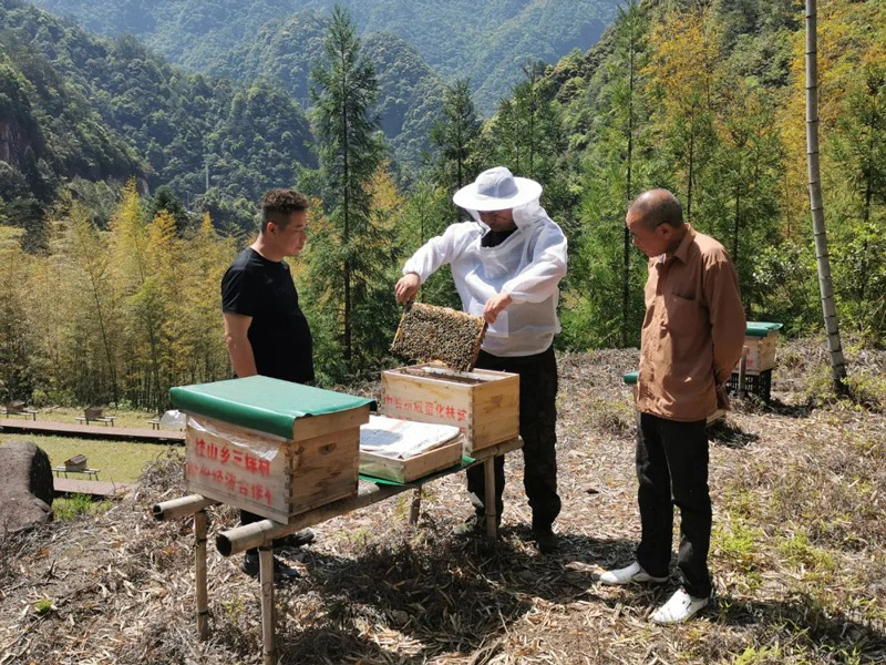當前,山間開花植物多,有利于蜜蜂繁殖。文成縣仙花谷農業專業合作社負責人周光彬趁著這個季節擴大蜜蜂養殖規模。在仙花谷蜂場里,村民劉玉光正向周光彬學習中蜂養殖技術。開始養蜂后,劉玉光不斷學習提升專業知識,養殖的蜜蜂從原本的5箱增加到現在的30多箱,收獲的蜂蜜由養殖戶兜底回購。劉玉光說:“以前種地,只能自給自足,F在養了幾箱蜂,收入高多了!